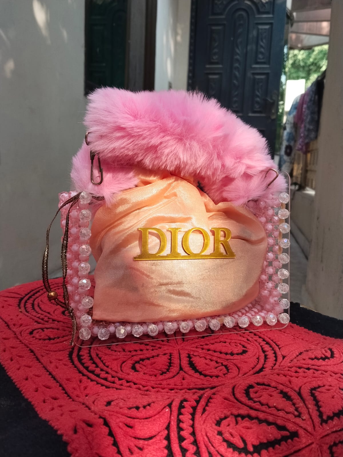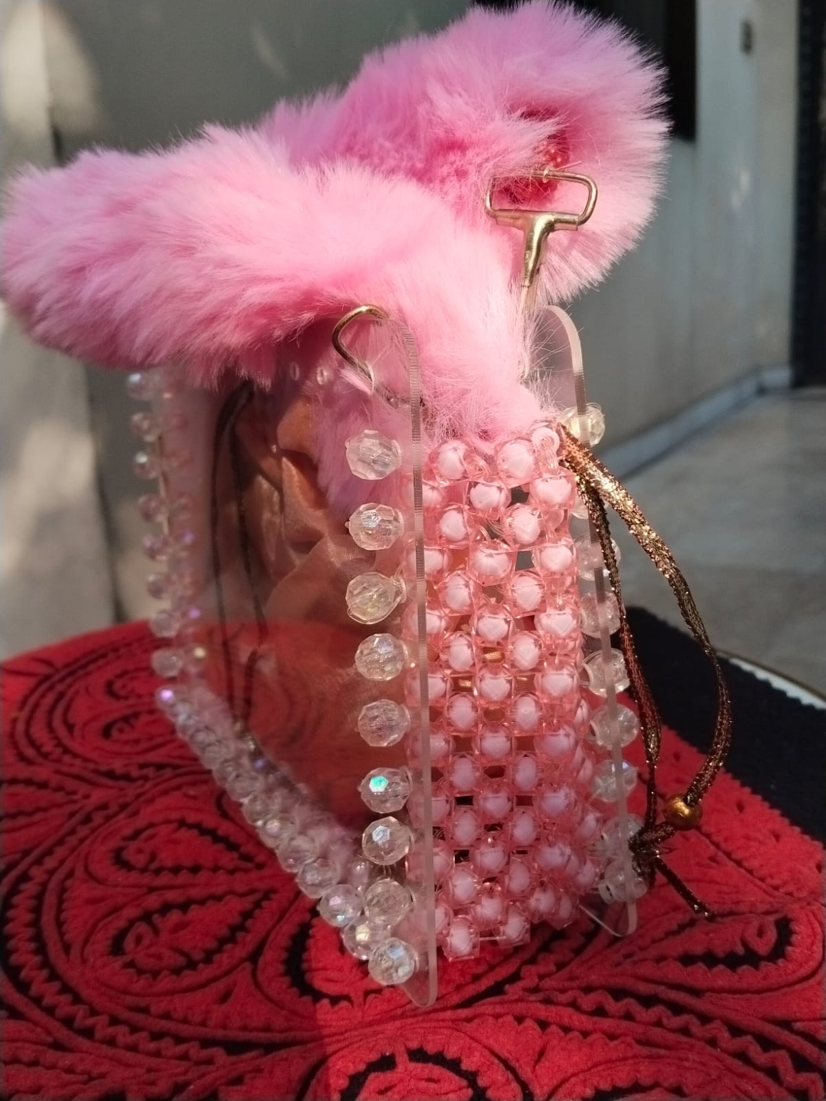 a pink colored arcylic hand bag with golden studs on it and fur handle with an inner potli